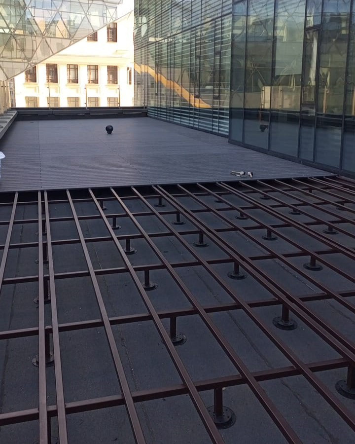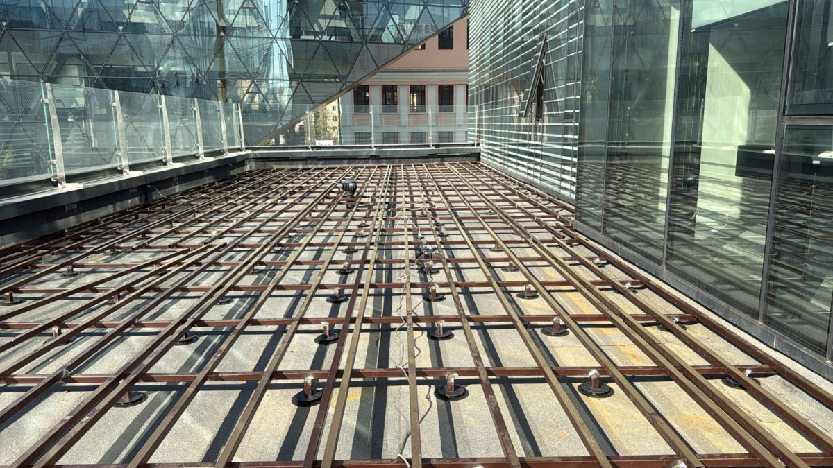 Произведен монтаж настила с металлокаркасом на опорах на открытом балконе.